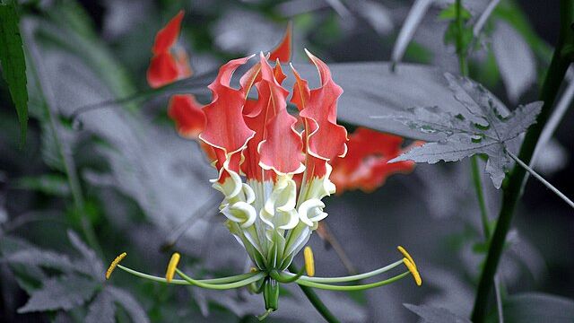 Listy jsou úzké, kopinaté a poměrně elegantní. Samy o sobě by člověka asi neohromily, ale mají jednu zajímavou vlastnost. Jejich konce bývají prodloužené a přeměněné tak, že fungují jako jakési úponky. Díky tomu se rostlina může zachytávat o okolní stonky, větve nebo jiné opory. Je to chytré řešení. Nemusí budovat silný stonek jako keř. Stačí jí, že se umí přichytit a vytáhnout tam, kde bude mít víc světla. Květ dělá z rostliny něco, na co se nezapomíná. Okvětní lístky jsou úzké, dlouhé a silně zahnuté dozadu. Někdy vypadají skoro jako jazýčky plamene, jindy zase jako extravagantní ozdoba. Barva květu bývá proměnlivá během vývoje. Zpočátku může být víc žlutá nebo zelenožlutá, postupně ale přechází do oranžové, červené a tmavě rudé. V jednom květu se tak často míchá několik odstínů najednou. To vytváří onen typický ohnivý dojem, kvůli kterému je rostlina v angličtině známá jako flame lily, tedy plamenná lilie.