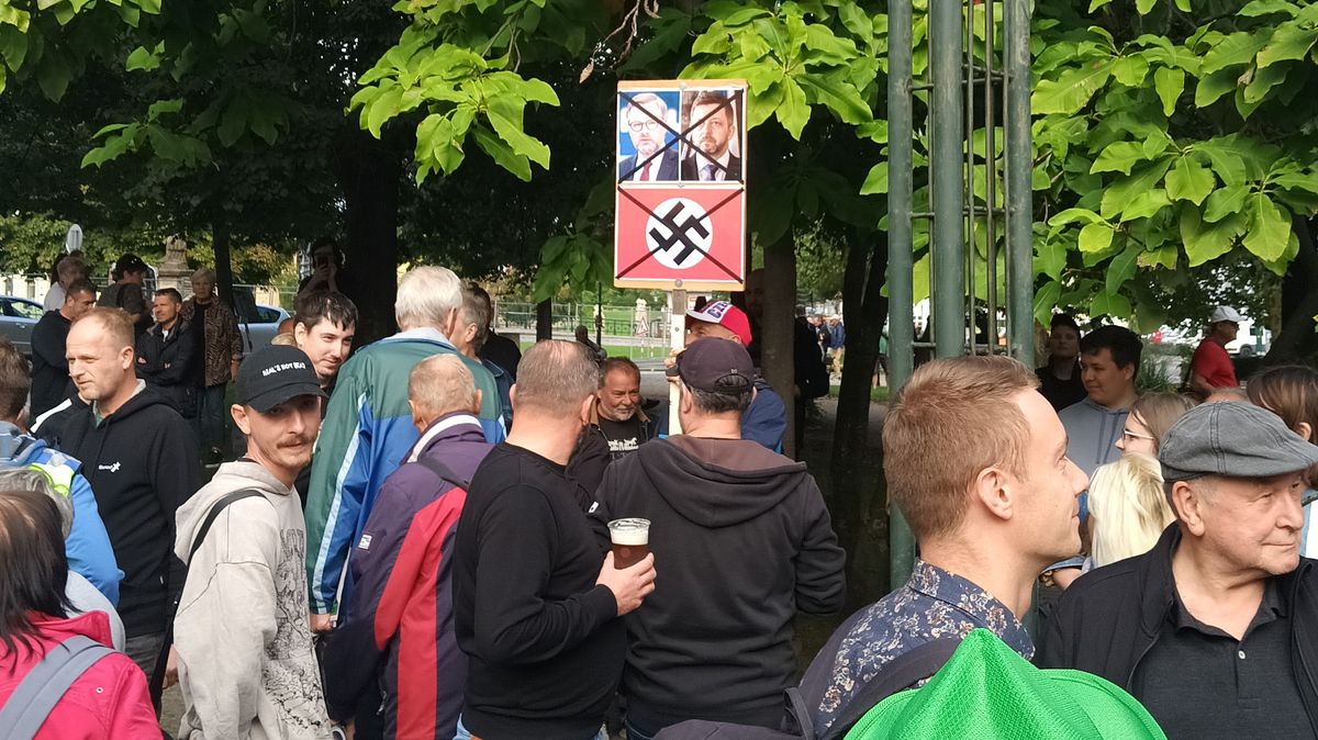 Když jsem chvíli před oficiálním začátkem akce na místo dorazil, pocítil jsem poměrně silně napjatou atmosféru. Celou příchodovou cestu zaujímali protestující, kteří neustále vykřikovali různá nespokojená hesla. Nad hlavami měli někteří z nich transparenty. Velmi výrazný byl například ten s přeškrtnutou vlajkou nacistického Německa a obličeji premiéra Fialy a ministra vnitra Rakušana.