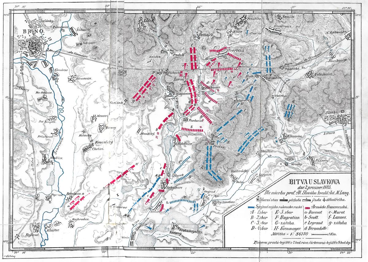 Francouzi se soustředili kolem vesnic Sokolnice, Telnice a Prateckého návrší. Napoleon přesně věděl, že klíč k vítězství spočívá v rozdělení nepřátelské armády a obsazení výšin, které kontrolovaly pohyb spojenců. Koaliční generál Weyrother však plánoval rychlý útok na střed francouzské linie. Tento pohyb napověděl Napoleonovi, kde udeřit.
