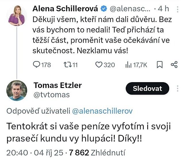 Bývalá ministryně financí Alena Schillerová z ANO krátce po zveřejnění výsledků poděkovala na své sociální síti svým voličů, a slíbila, že je nezklame. Tomáš Etzler odpověděl vulgárním komentářem s překlepy. „Tentokrát si vaše peníze vyfotím i svoji prasečí ku*du vy hlupáci! Díky!!,“ ukázal svou úroveň Tomáš Etzler.