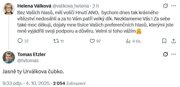 Volby 2025 projely vládnoucí strany a zatímco samotní politici bývalé koalice jejich výsledky přijali, jak se sluší a patří, našli se v řadách jejich příznivců lidé, kteří to nezvládli. Nejodpudivějším případem se ukázal být bývalý elitní novinář Tomáš Etzler, který z úst spustil slovní průjem, kterými zahrnul ženy z kandidátek ANO a Stačilo!