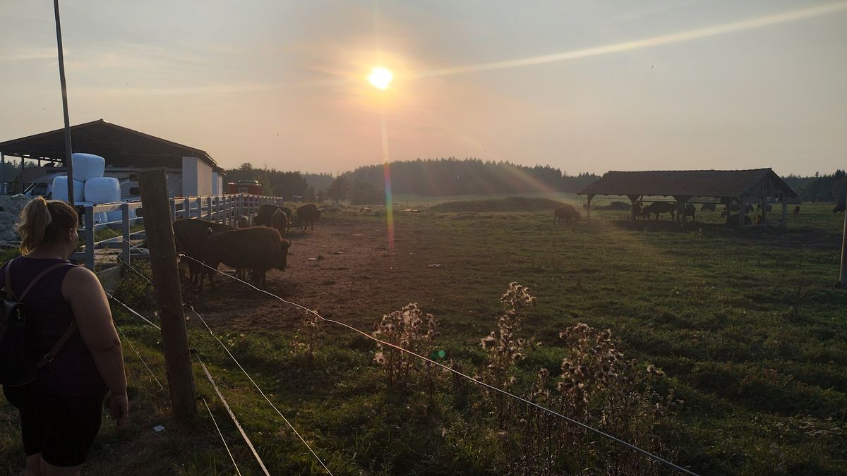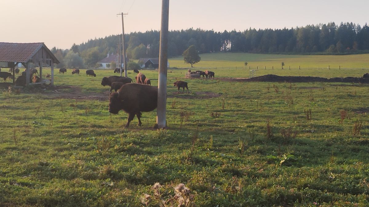Cíl nás přivítal pastvinami a ohradníky. Okamžitě se dostavil ten hřejivý pocit: sprcha, jídlo, spánek. Naše ubytování – Bizoní farma – bylo nečekaně okouzlující. Všude bizoni, dětský koutek pro klid rodičů, socha bizona… prostě elegantní a neobvyklé prostředí.
