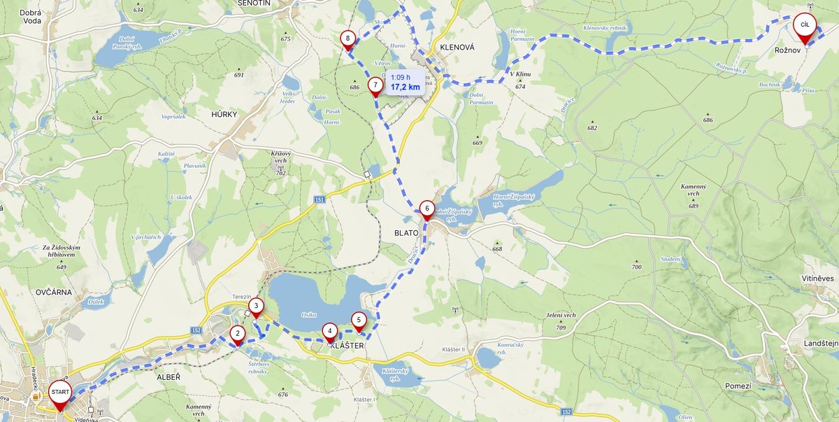 Nová Bystřice. Poslední lok, cinknutí mincí a odlepujeme se od barového pultu. Venku pálí slunce, ale my víme: teď už jen do cíle. Mise je jasná — Rožnov, 17,2 km. Ideální oddechovka před večeří a zaslouženým odpočinkem v našem ubytování.