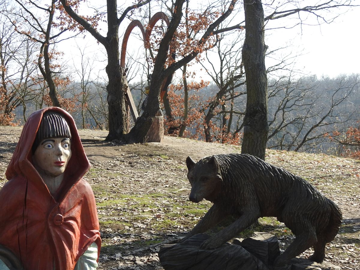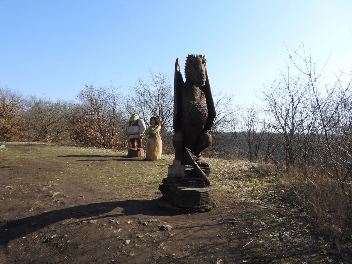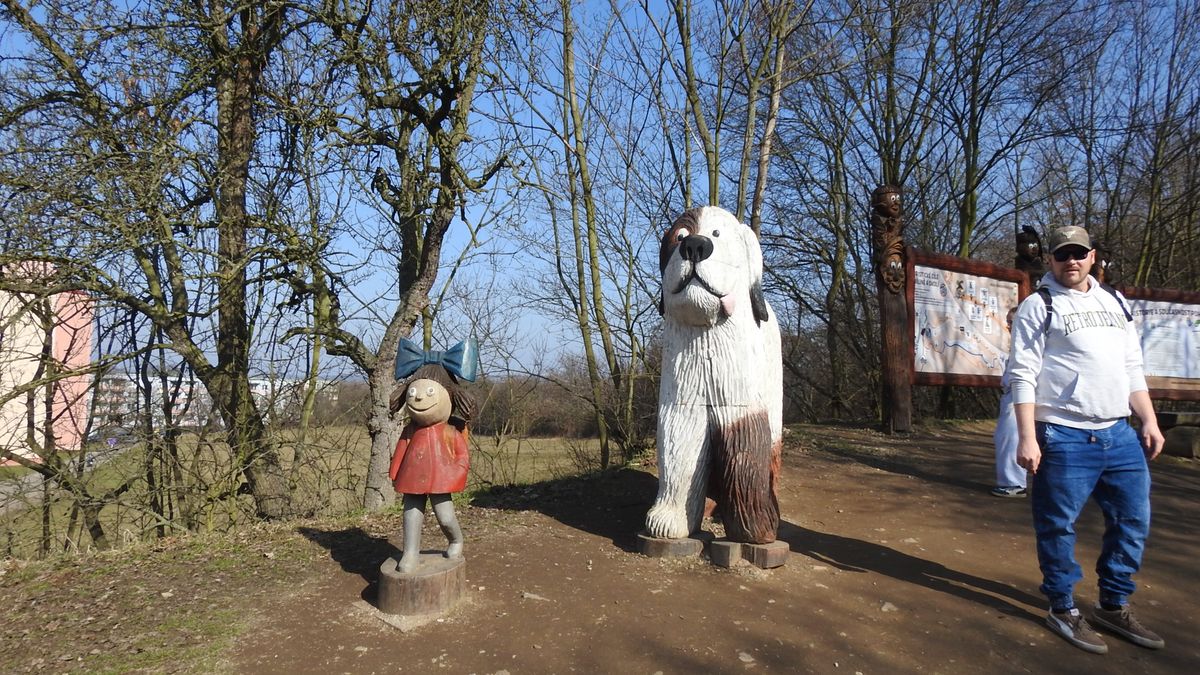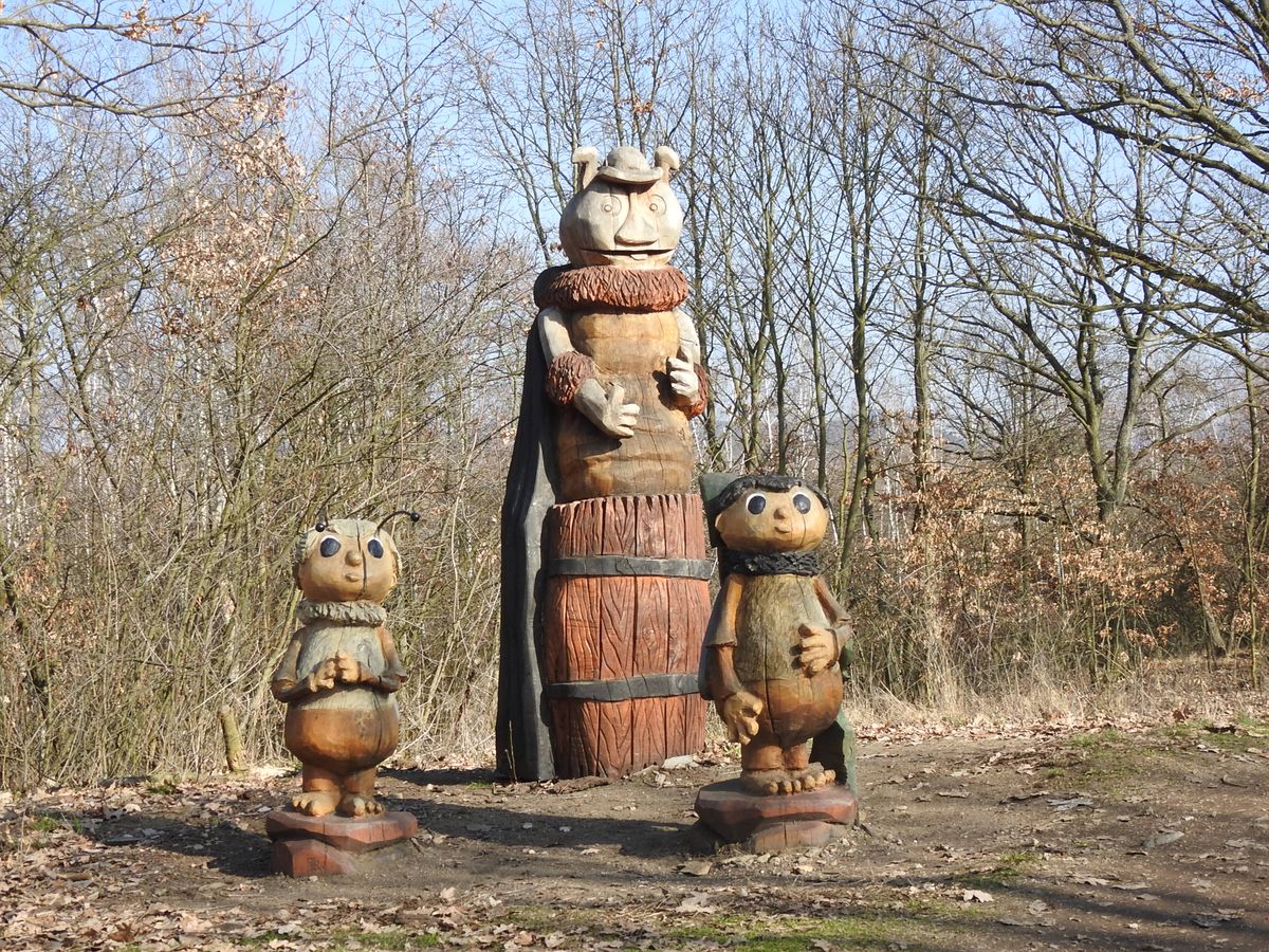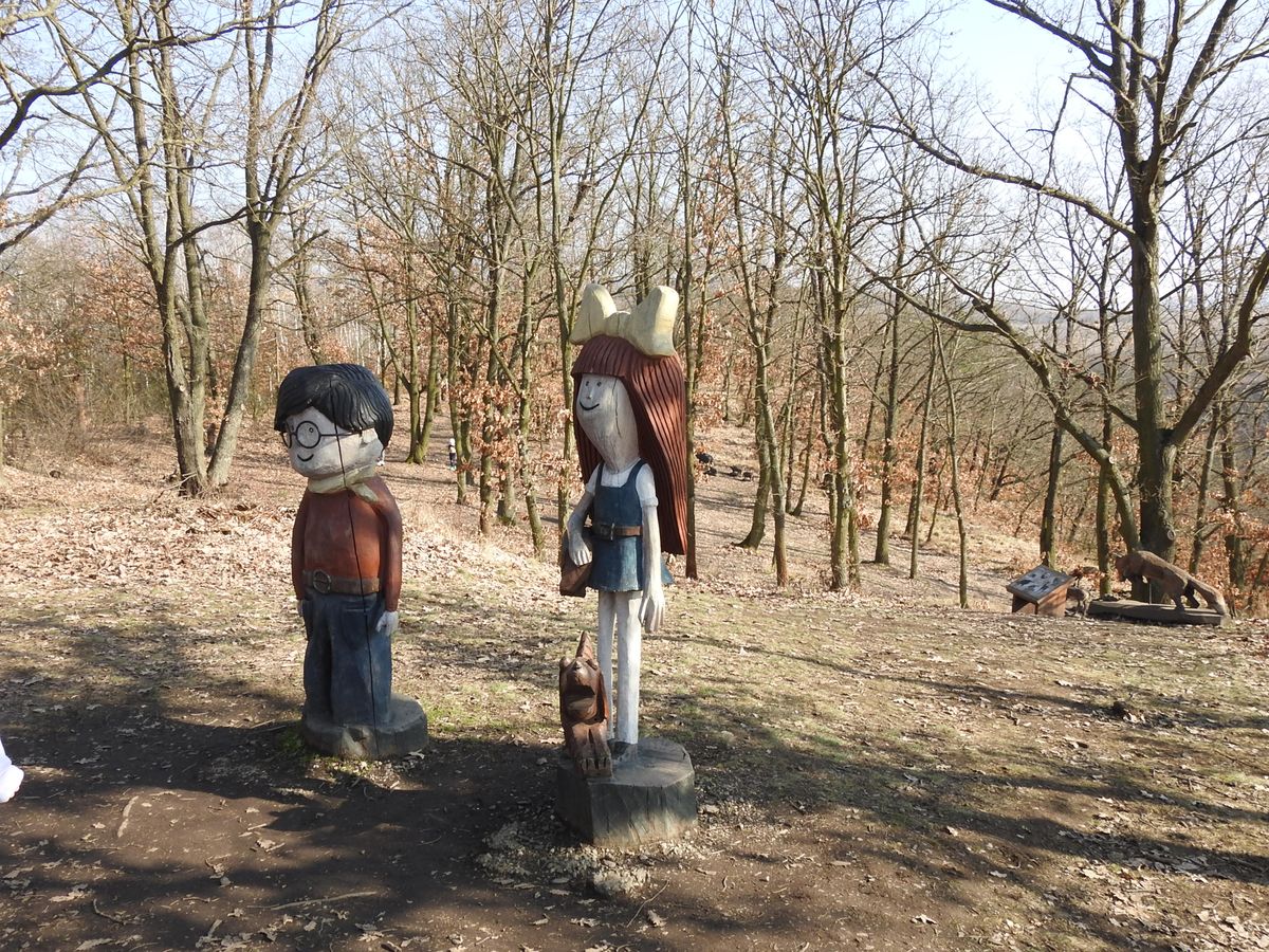 Právě u Áji a Fíka začíná asi kilometr a půl dlouhá stezka po dlouhém skalním hřbetu, na kterém narazíte na asi 160 dřevěných plastik. Tady i mrzoutovi naskočí úsměv na tvář.
