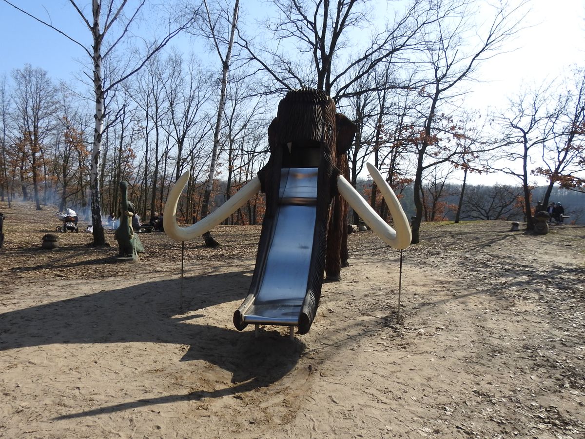 Jako klouzačka slouží opodál stojící třímetrová socha mamuta. Obě atrakce jsou asi v půlce stezky, najdete zde i vyhlídkovou lavičku se sochou pana Sýkory, který je autorem nápadu a prvním realizátorem. V těchto místech je i ohniště s lavicemi, kde si můžete opéci nějakou mlsku.