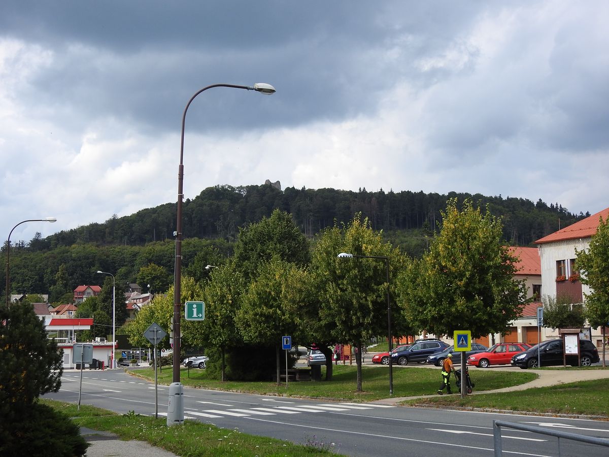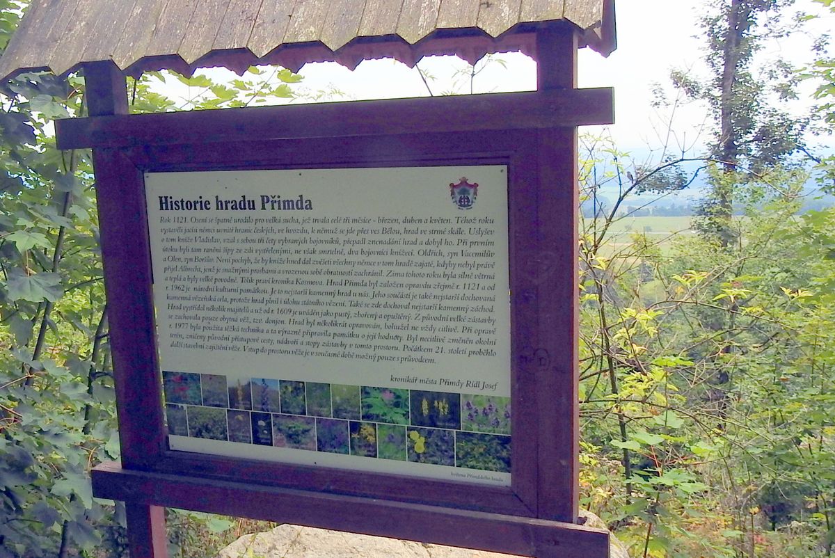 Informační tabule na plošině před hradem upozorňuje, že se tu v roce 1925 konalo velké shromáždění lidu, slavnost připomněla 1000leté výročí založení hradu. Proběhla i slavnostní mše, poté divadelní hra o dobývání Přimdy, což mně připomenulo scénu z výtečné komedie Páni kluci. Na malém prostranství se mačkalo na 20 tisíc lidí a hospodští a jarmarečníci si přišli na své.