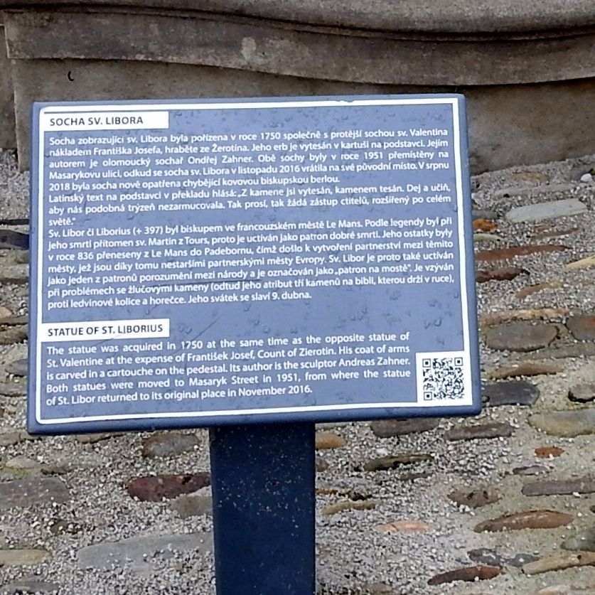 Když jsem navštívil nedávno Valašské Meziříčí, narazil jsem na několik barokních skulptur rozmístěných po městě. Zarazil mě svatý Libor, oněm jsem se dozvěděl z infotabule následující. Viz obrázek