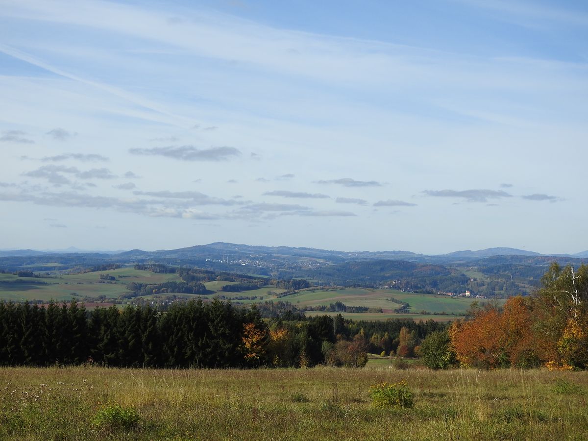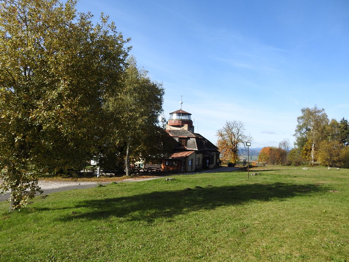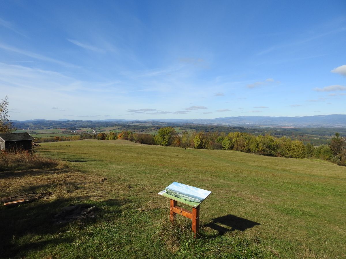 Bohužel ne z rozhledny, o které řada webů stále tvrdí, že je zavřena, přestože znovu funguje již od roku 2010. Na Krkonoše z ní nevidíte, jsou zakryté stromy, věžička na restauraci je nízká. Ale na druhou stranu, na jih a západ, spatříte Ještědsko- kozákovský hřeben, Český ráj, Bezděz, Říp…