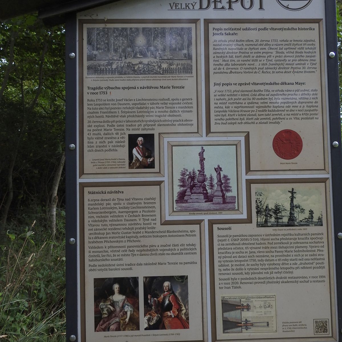 Na informační tabuli nacházející se v oblasti Depotu (je jich tu deset) můžeme číst, co napsal ve svých pamětech místní farář děkan May: Celá dílna od zapáleného prachu, s dělníky nahoře i dole, jichž počet asi ku devadesáti byl, byla rozmetána, většina z nich na místě roztrhána spálena. Velmi mnoho popálených dopraveno do města, kde v nepřítomnosti vojenského kaplana ode mne a kaplana Leopolda Václava Krause po dvě neděle každodenně ve dne v noci zaopatřováni byli. Kteří v ležení zůstali, tam také zemřeli a na místě u kříže později postaveného pohřbeni byli. Pozůstalí na živu buď oslepli neb ohluchli a zůstali invalidy.“
