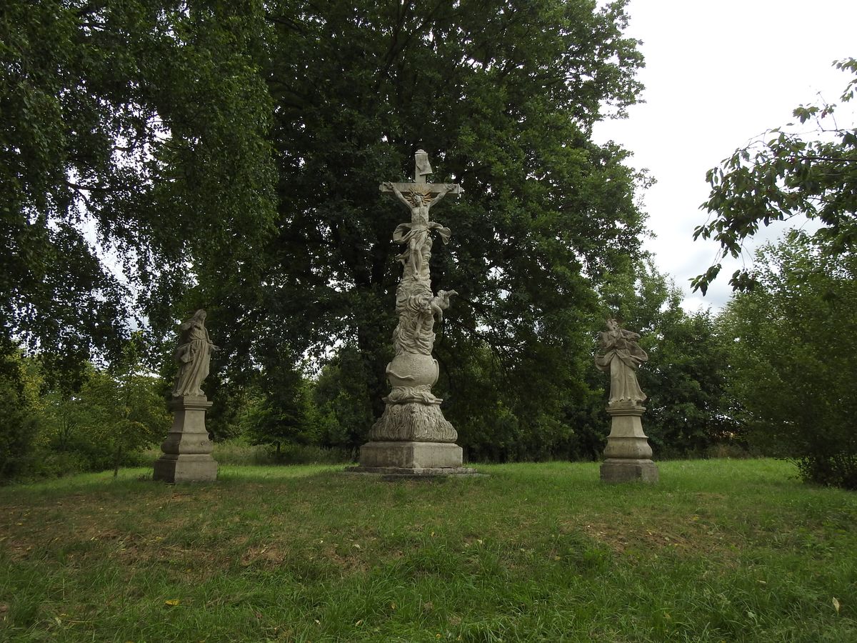 Vpravo od krucifixu stojí socha sv. Jana, vlevo socha Panny Marie Sedmibolestné.