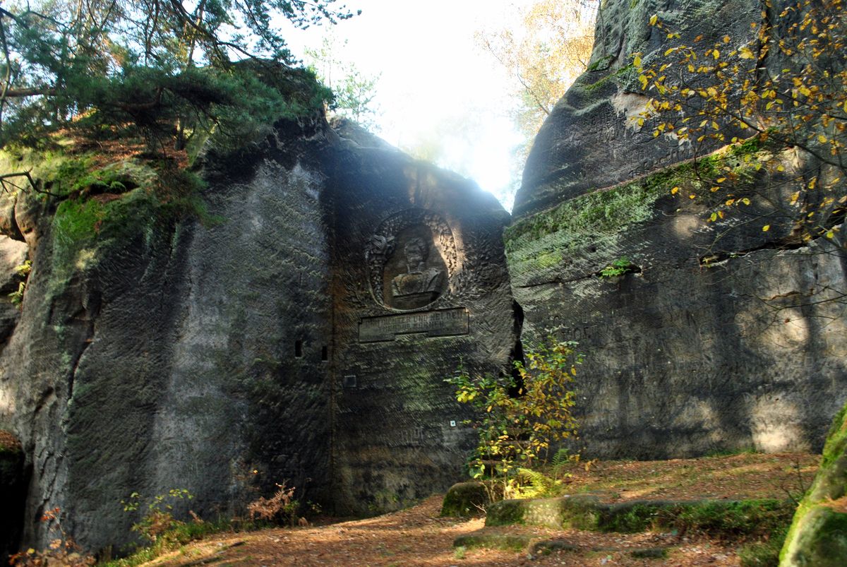 Zhruba za čtvrt hodiny dojdeme k cíli. Za Dutým kamenem je proláklina ve skále, na níž je vytesán velký reliéf německého básníka Theodora Körnera (1791 až 1813.). V roce 1913 ho vytvořili členové zmíněného spolku - řídící učitel Karl Beckert a četnický strážmistr Karl Bundesmann. Ti se podíleli na výzdobě skal v Kunratickém Švýcarsku. (Například Skála smrti u Kunratic u Cvikova nebo reliéf Útěk do Egypta, kamenný oltář u Mařenic…)