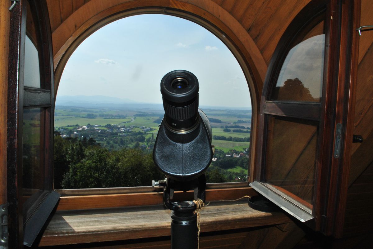 Z věže si můžete zabudovanými dalekohledy přiblížit okolí, třeba nedaleký historický Nový Jičín s množstvím památek včetně Laudonova úmrtního domu nebo žerotínského zámku.
