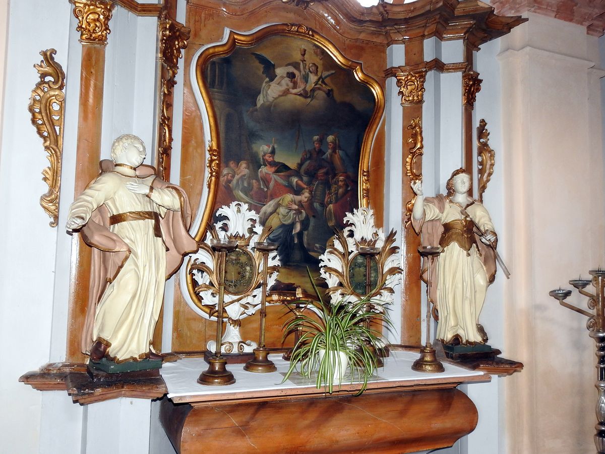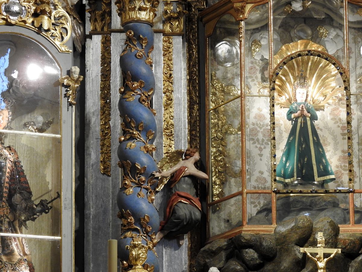 Oltář s hornopoličskou madonou a ostatkovými figurami svaté Kristiny a sv. Petra