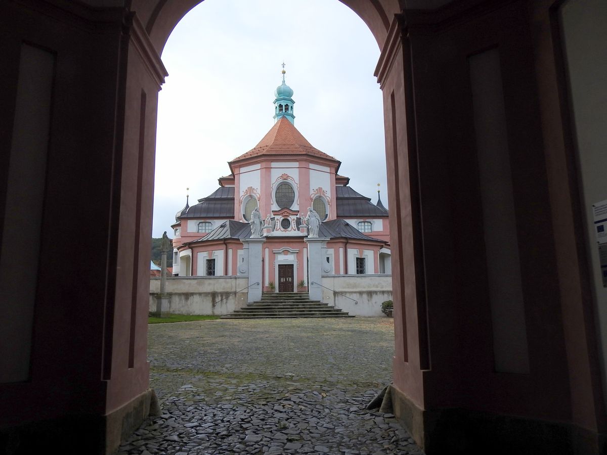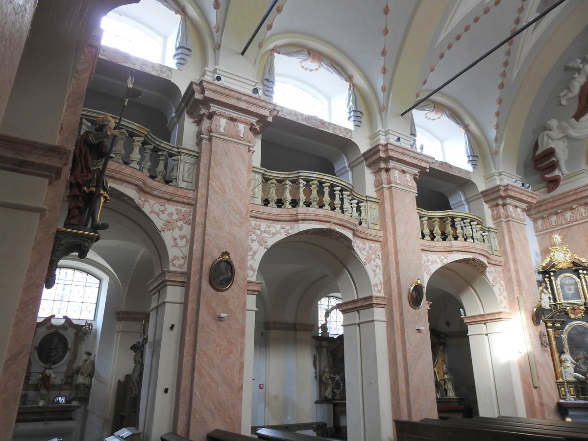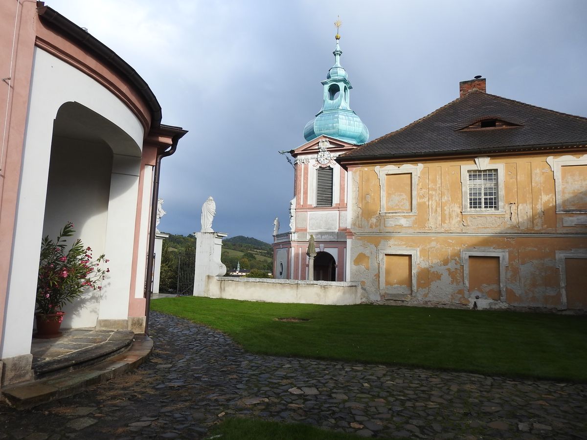 Po schodišti vystoupáte do ambitového traktu, kostel má boční vchody, k hlavnímu se dostanete po obejití stavby.