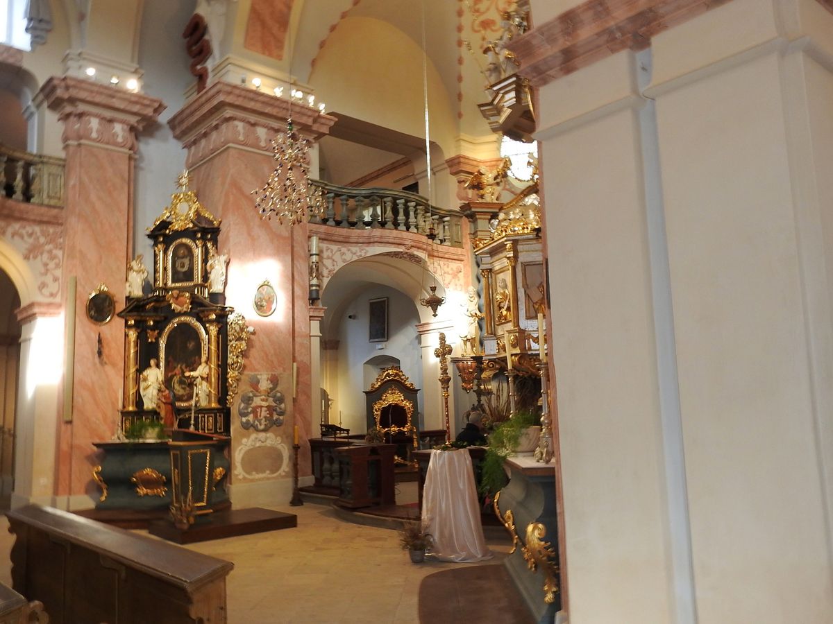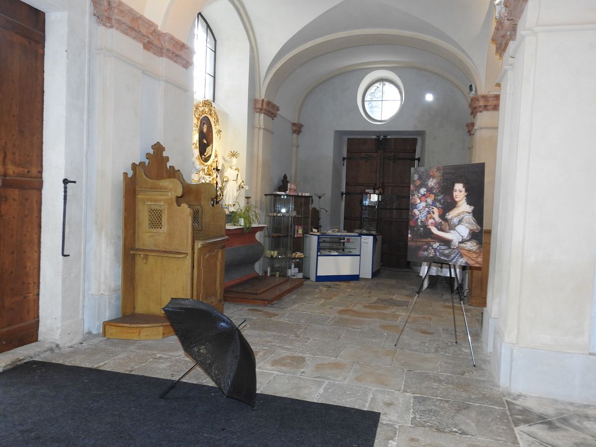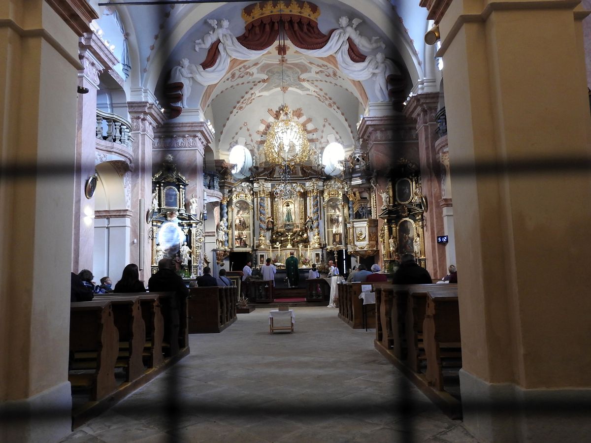 Po schodišti vystoupáte do ambitového traktu, kostel má boční vchody, k hlavnímu se dostanete po obejití stavby.