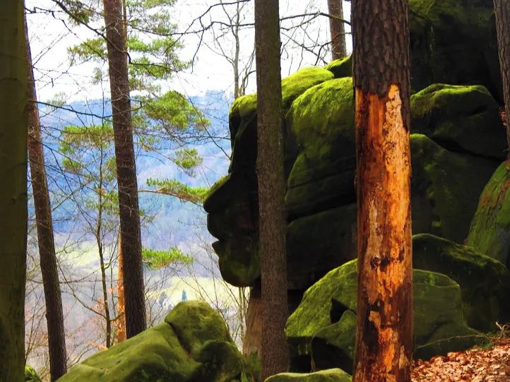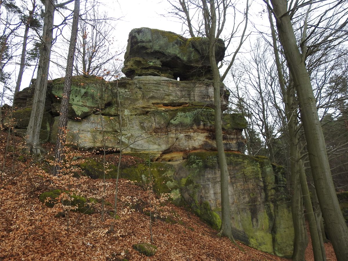 Šel jsem několik desítek metrů po silnici, pak vlevo stezkou mezi domky do lesa, a narazil v předhradí na mohutnou skálu vypadající jako lidská hlava.