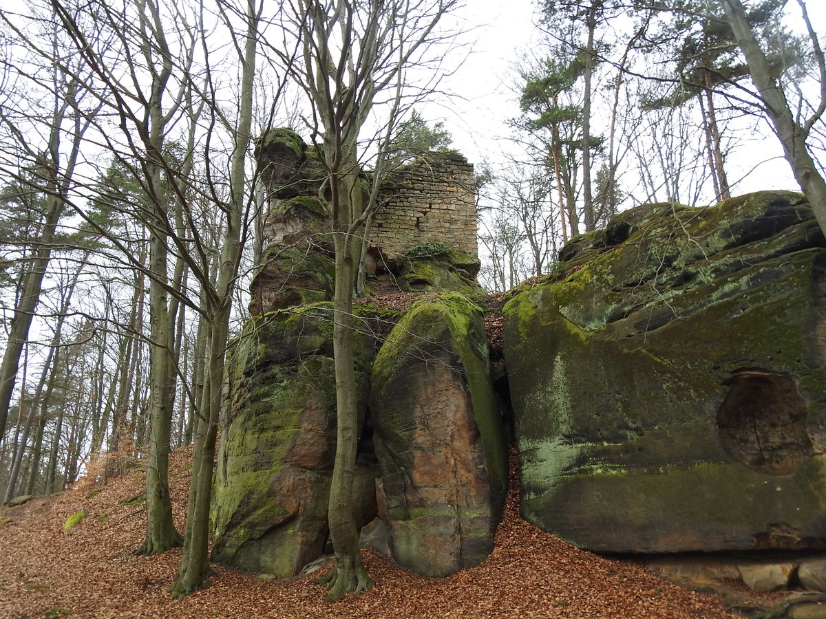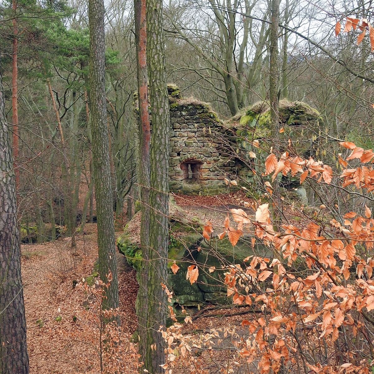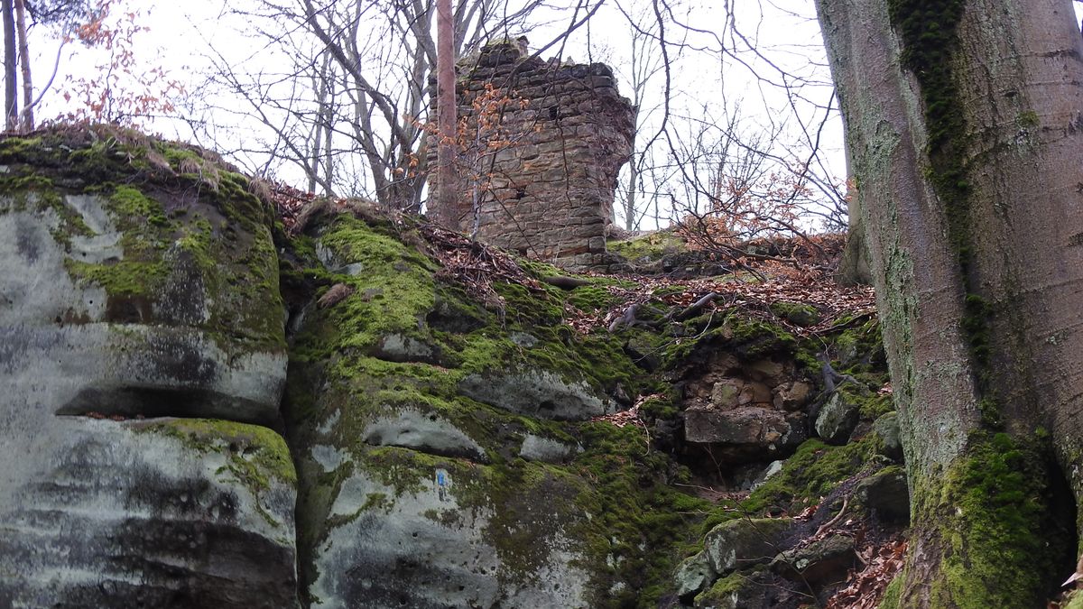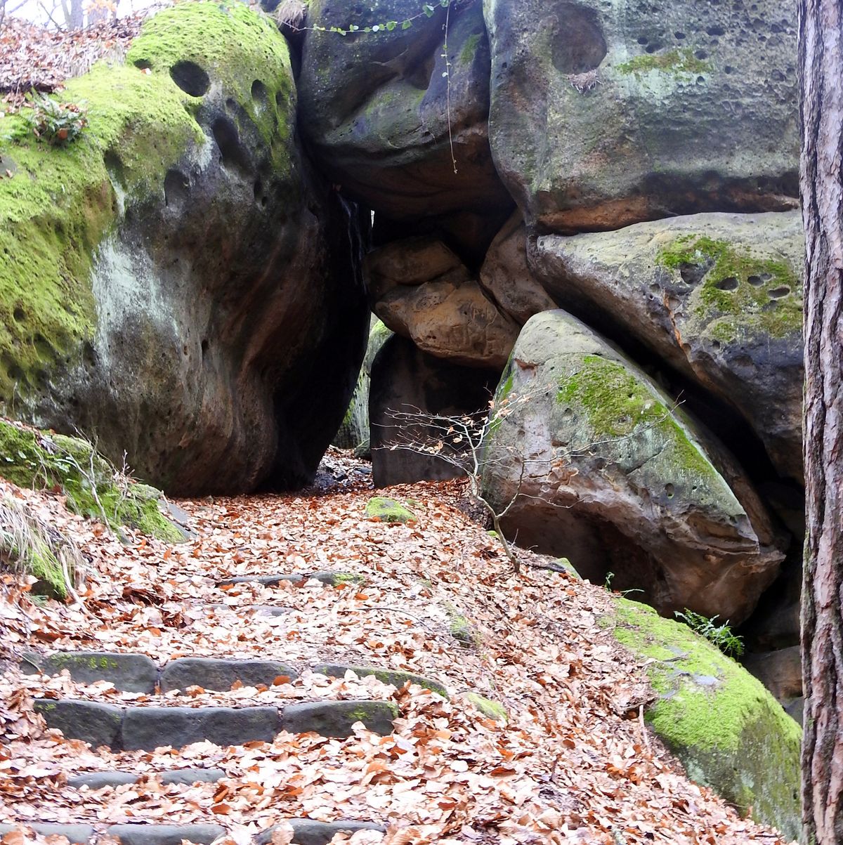 Do zříceniny vystoupáte po schodech vytesaných v pískovci. Jsou pokryty vrstvou bukového a habrového listí, je potřeba dávat pozor na každý krok, docela to klouže.