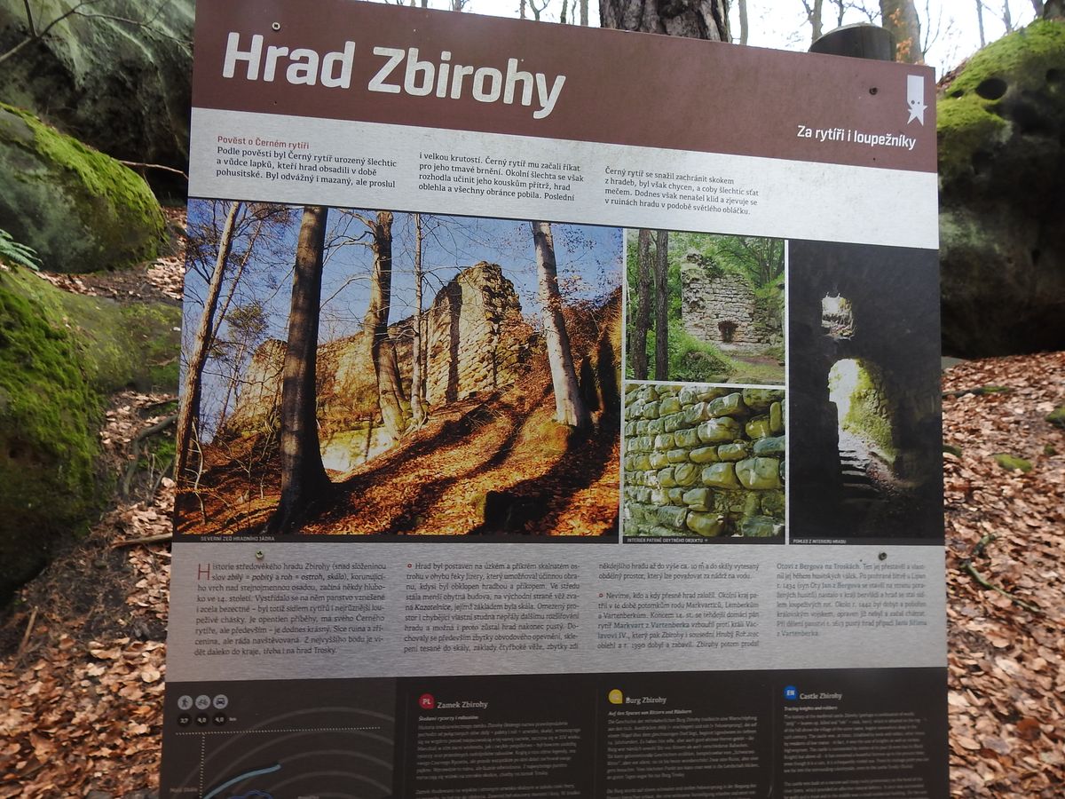 Na Zbirohy (někdy i Zbiroh) jsem se dostal při putování z hradu Frýdštejna, kde se natáčela část kultovní pohádky O princezně Jasněnce a létajícím ševci. Poté následovalo po červené trase Zlaté stezky Českého ráje zastavení na Vranově. Času bylo dost, přešel jsem po mostě Jizeru a vydal se do protilehlého kopce. Trochu táhlá cesta, ale opět zafungoval stop a za pár minut mě ochotná paní vysadila v obci Zbirohy. Název jasně určil, jakže se bude ruina místního hradu jmenovat.