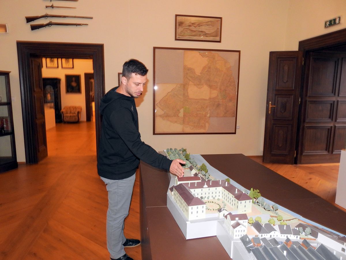 Kastelán Jan Anlauf nad modelem zámku při výkladu o káznici