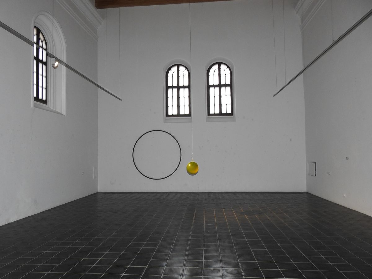 Končíme v kapli /galerii, kde je instalace moderního umění. Uprostřed velkého prostoru visí od stropu koule.
