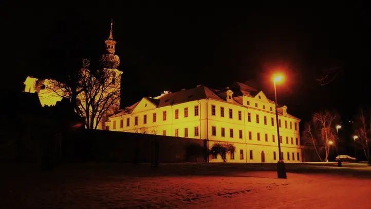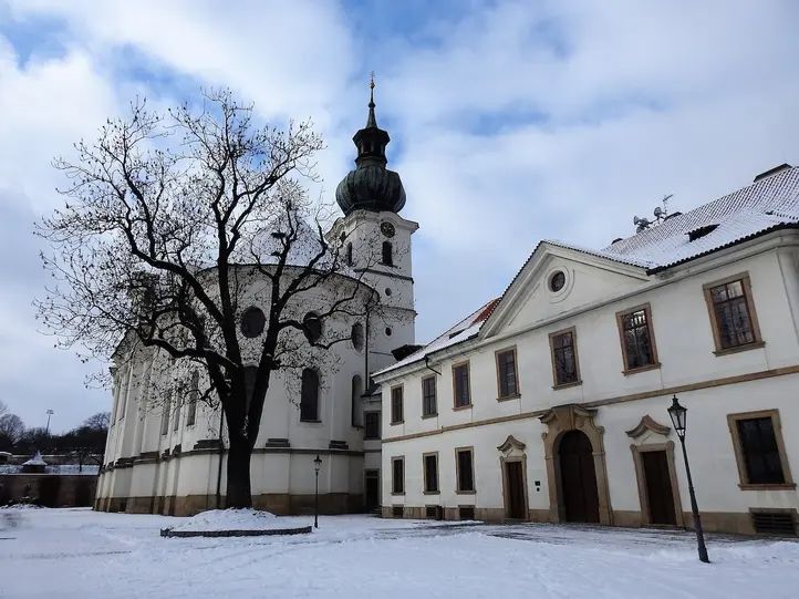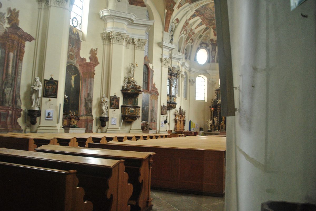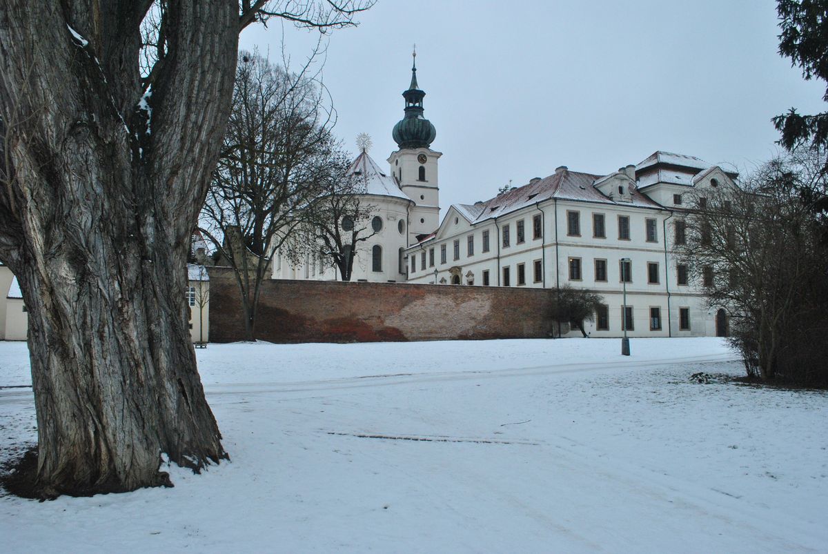 V noci je to jiné, hlavně když jsou stromy bez listí, to je areál ozářen reflektory. Dovnitř se ale nedostanete, večer se zamyká. Pojďme se jím tedy projít ve dne, kdy je možné při bohoslužbách nebo komentovaných prohlídkách navštívit i kostel. Prohlídky jsou každý víkend, 10 a 14. hodin, jde to také individuálně pro skupiny ve všední den. Platí se v infocentru kláštera.