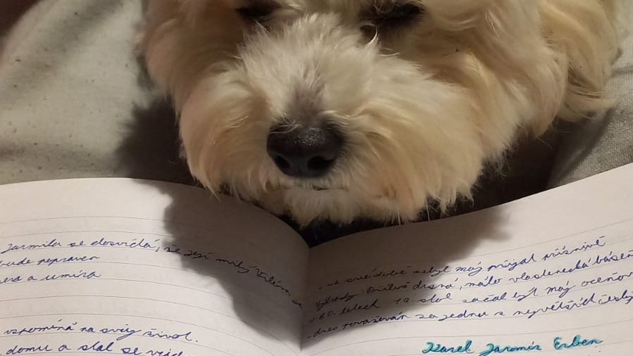 Neohrabaně šplhá na parapet a uvelebený mezi seschlým fikusem a nezničitelným potosem na mě přes celou třídu zakřičí.