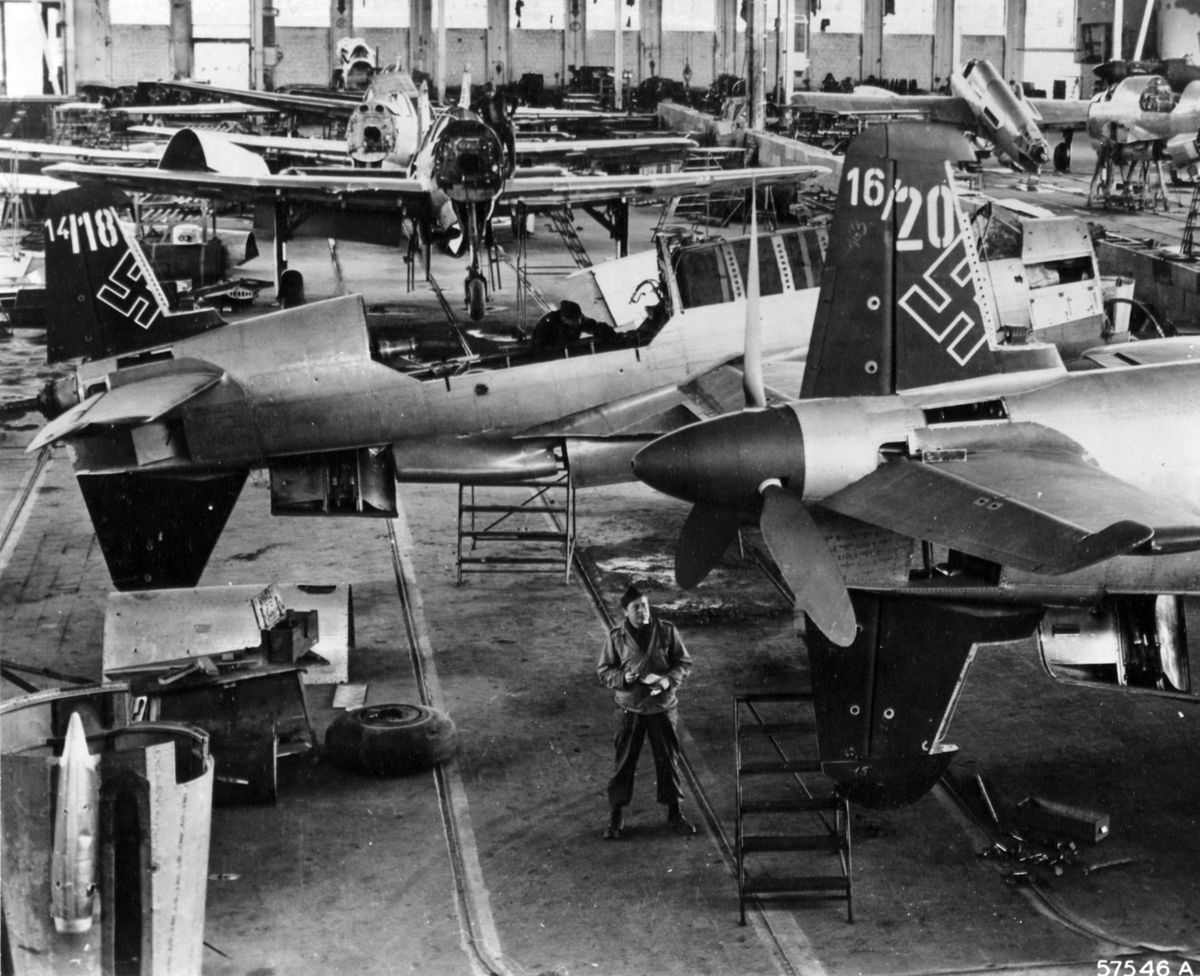 Letadla Dornier Do 335 v různých stavech montáže v závodě Dornier