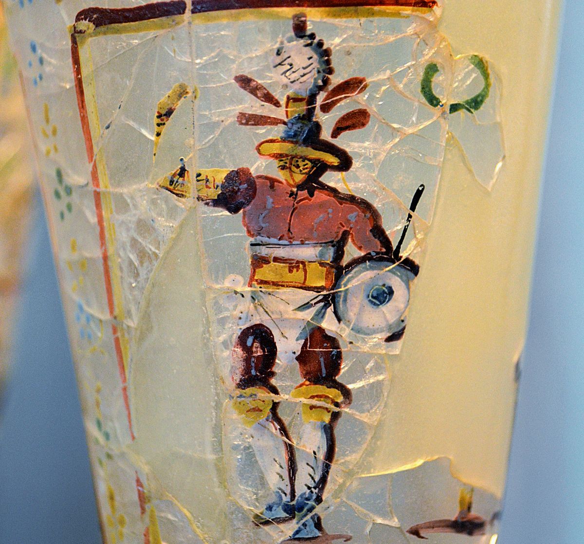 Římský gladiátor namalovaný na skleněné kádince z římského Egypta, nalezený v Begramu