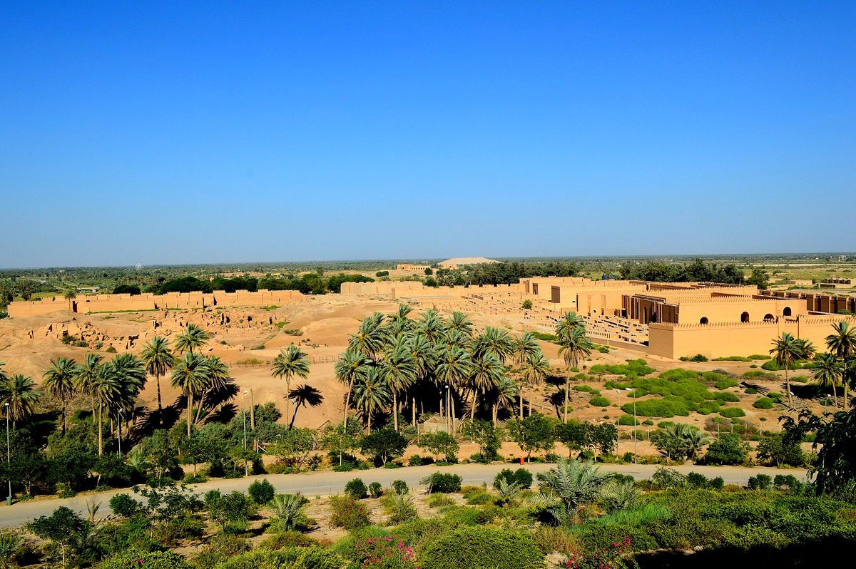 Starověké město Babylon. Rekonstruovaný Jižní palác je vpravo, zatímco ruiny Severního paláce jsou uprostřed