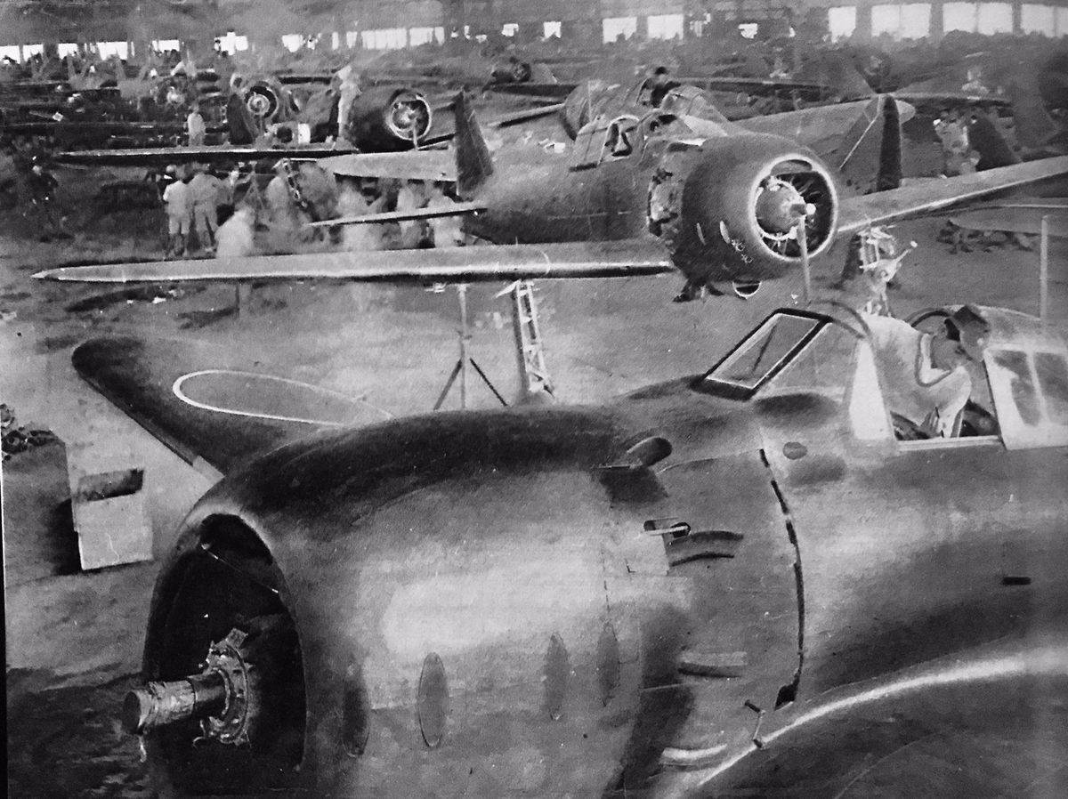 Montážní linka stíhaček Mitsubishi A6M5 Model 52 Zero v závodě Koizumi společnosti Nakajima Aircraft Company