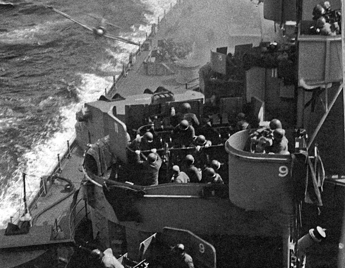 Kamikaze útok na USS Missouri, 11. dubna 1945. A6M „Zero“ narazilo do boku lodi pod hlavní palubou