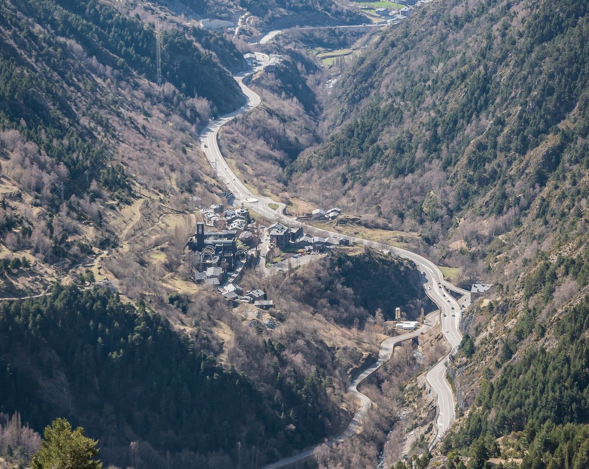 Poutní místo Meritxell. Údolí Valira d'Orient při pohledu z vyhlídky Roc del Quer, farnost Canillo, Andorra