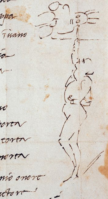 Sonet od Michelangela o malování stropu Sixtinské kaple, doprovázený skicou jeho samotného při malování