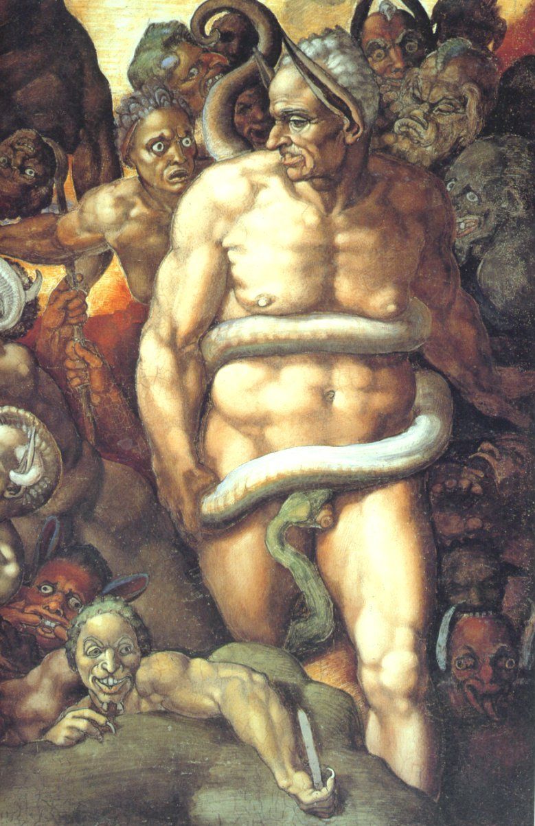 Ještě drsnější pomstu si Michelangelo připravil o desítky let později při malování Posledního soudu na oltářní stěnu. Papežský ceremoniář Biagio da Cesena kritizoval dílo pro přílišnou nahotu a označil ho za vhodné spíše do lázní či krčmy. Michelangelo zareagoval okamžitě: namaloval Cesenu do pekla jako Mínose, soudce podsvětí. Přidal mu oslí uši (symbol hlouposti) a nechal hada, aby mu hryzal genitálie. Když si Cesena stěžoval u papeže, ten se prý jen zasmál a řekl, že jeho pravomoc sahá jen do očistce, ale v pekle nemá žádnou moc.