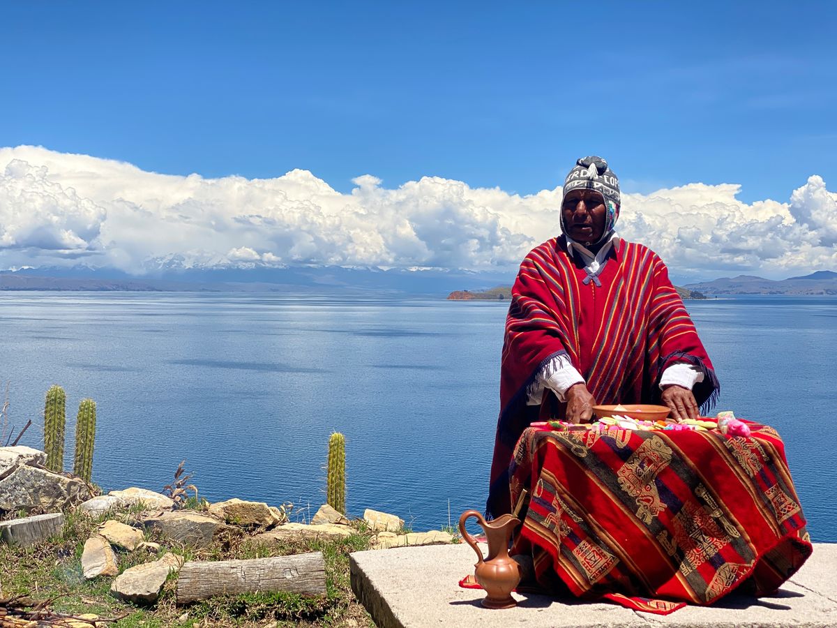 Muž z Aymara Yatiri provádějící posvátný rituál u jezera Titicaca