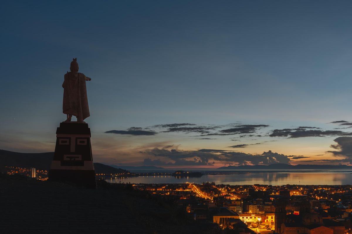 Vyhlídka z kopce Huajsapata na jezero Titicaca, v popředí socha Manca Capaca - legendárního zakladatele říše Inků