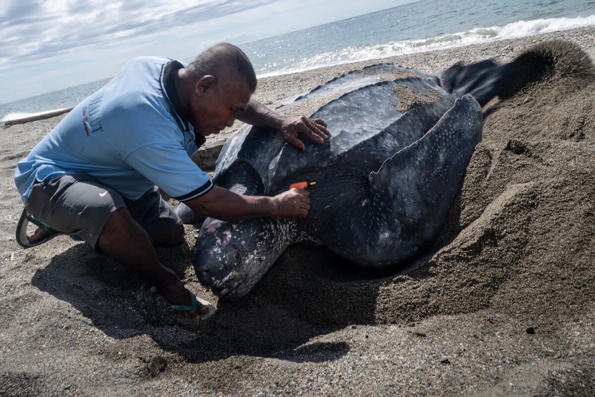 Ochranář čipuje želvu, která klade vajíčka, aby ji bylo možné sledovat. (c) WWF – Sirachai Arunrugstichai