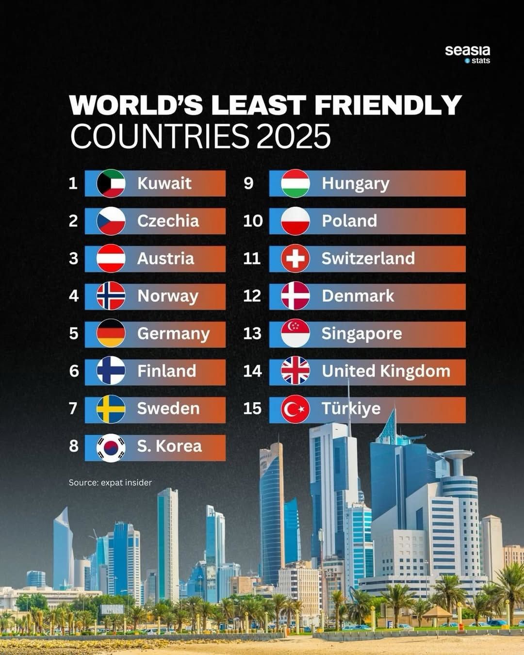 Zatímco na dovolené v Praze si turisté často nemohou vynachválit levný alkohol a architekturu, tak cizinci, kteří se zde snaží zapustit kořeny, naráží do zdi. V kategorii přívětivost nás vnímají jako uzavřenou komunitu, do které neexistují jednoduché vstupní dveře. Hůře než Česko dopadl v hodnocení pouze Kuvajt. To je společnost, ve které se ocitáme. Nechali jsme za sebou i země, které jsou tradičně považovány za příliš byrokratické. Pro běžného Čecha je to možná šokující zjištění. Považujeme se za národ se smyslem pro humor, který se rád druží v hospodě. Jenže pohled zvenčí ukazuje, že se družíme rádi, ale jen mezi sebou.