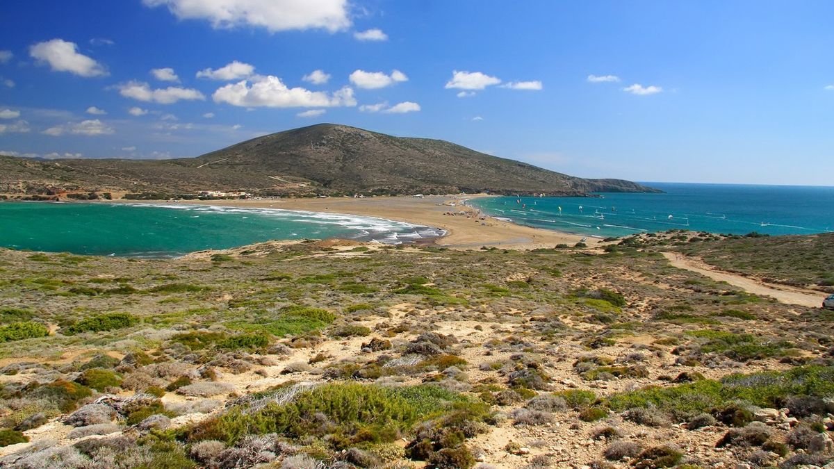 Divoká laguna s bělostným pískem a tyrkysovou vodou. Výhled na barevnou mozaiku jezírek z okolních skal patří k tomu nejhezčímu, co můžete v celém Řecku spatřit.