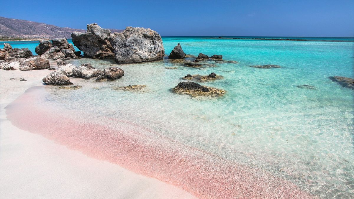 Návštěva Elafonisi je jako výlet do tichomořského ráje. Pláž je proslulá mělkou lagunou a pískem, který má díky drceným mušlím magický růžový nádech vytvářející kontrast s tyrkysovou vodou.