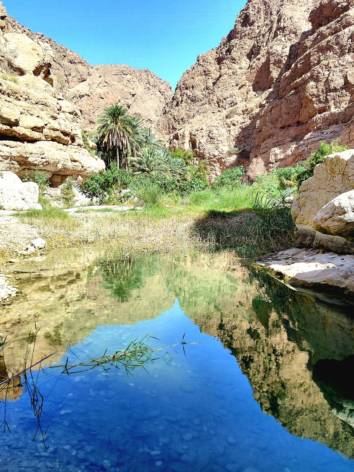 Omán při pohledu z výšky vypadá hornatě a vyprahle, ale zdání klame. Úzkými kaňony ve strmých horách se občas vinou říčky, z nichž se v případě vzácných, ale prudkých dešťů mohou během pár minut stát veletoky. A i v období sucha se voda tu objevuje a hned zase ztrácí mezi kameny a celý rok v mnohých kaňonech zůstávají jezírka lákající turisty ke koupání a místní k budování kanálů, které by vodu dovedly až k jejich polím.
