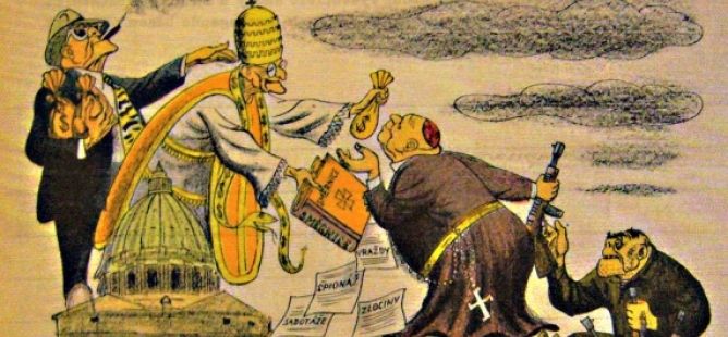 Tato protipapežská karikatura ukazuje, kdo Vatikán sponzoruje, a že církev pak za tyto peníze nakupuje zbraně, aby mohla svrhnout režim KSČ.