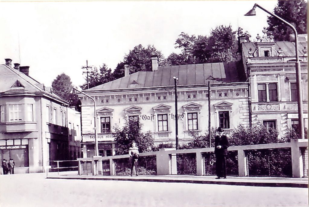 Hostinec Snaha ve Vsetíně u křižovatky na břehu Bečvy z roku 1940, tedy přibližně z doby, kdy jej navštívil Himmler. Na průčelí je vidět německý nápis Gast haus.