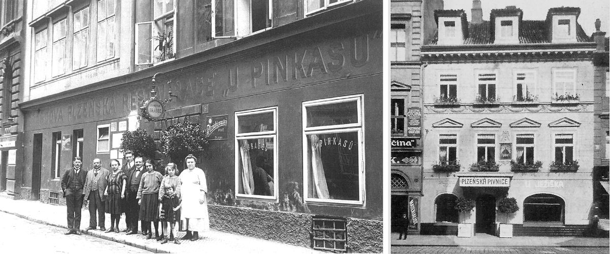 Dvě legendární hospody. Vlevo U Pinkasů, tehdy Brabcova plzeňská restaurace U Pinkasů. František Brabec (druhý zleva) s rodinou a personálem. Vpravo restaurace U Ježíška ve Spálené ulici. Dům dnes neexistuje. Pohlednice z roku 1923.