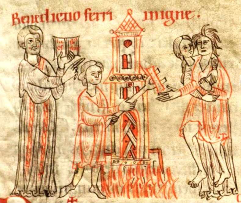 Ordál ohněm. Podezřelý bere do rukou rozžhavené železo.