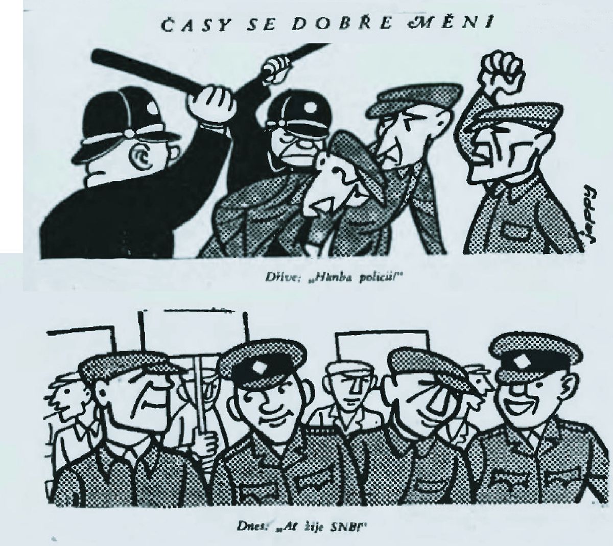 Na malůvce nazvané v novinách KSČ Naše pravda z roku 1948 prvorepublikoví četníci mydlí dělníky (Dříve: Hanba policii!). Na druhém obrázku je již vidět nerozborné přátelství mezi komunistickými esenbáky a spokojenými prorežimními dělníky (Dnes: Ať žije SNB!)