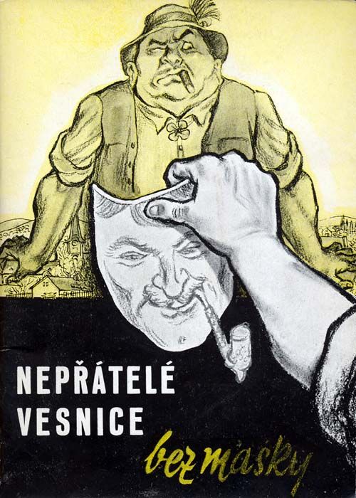 Propagandistický leták, na němž dělník demaskuje zakukleného statkáře či kulaka coby třídního nepřítele.