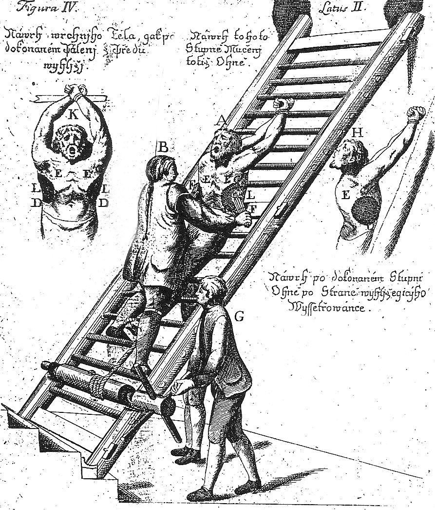 Průběh tortury. Přítomen byl lékař i zapisovatel