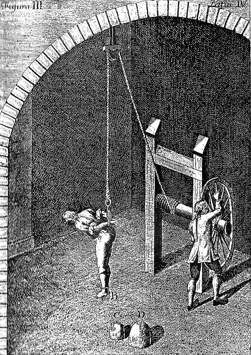 V mučírně před útrpným výslechem. Vpravo konšelé a krevní písař, kat svazuje vyslýchanému ruce za záda a pacholek už stojí u rumpálu skřipce. Středověká rytina