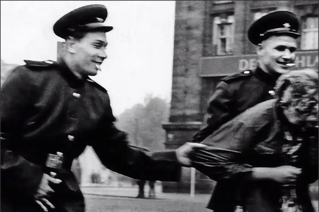 Natěšení Rusové se chystají v Berlíně hromadně znásilnit mladou Němku.